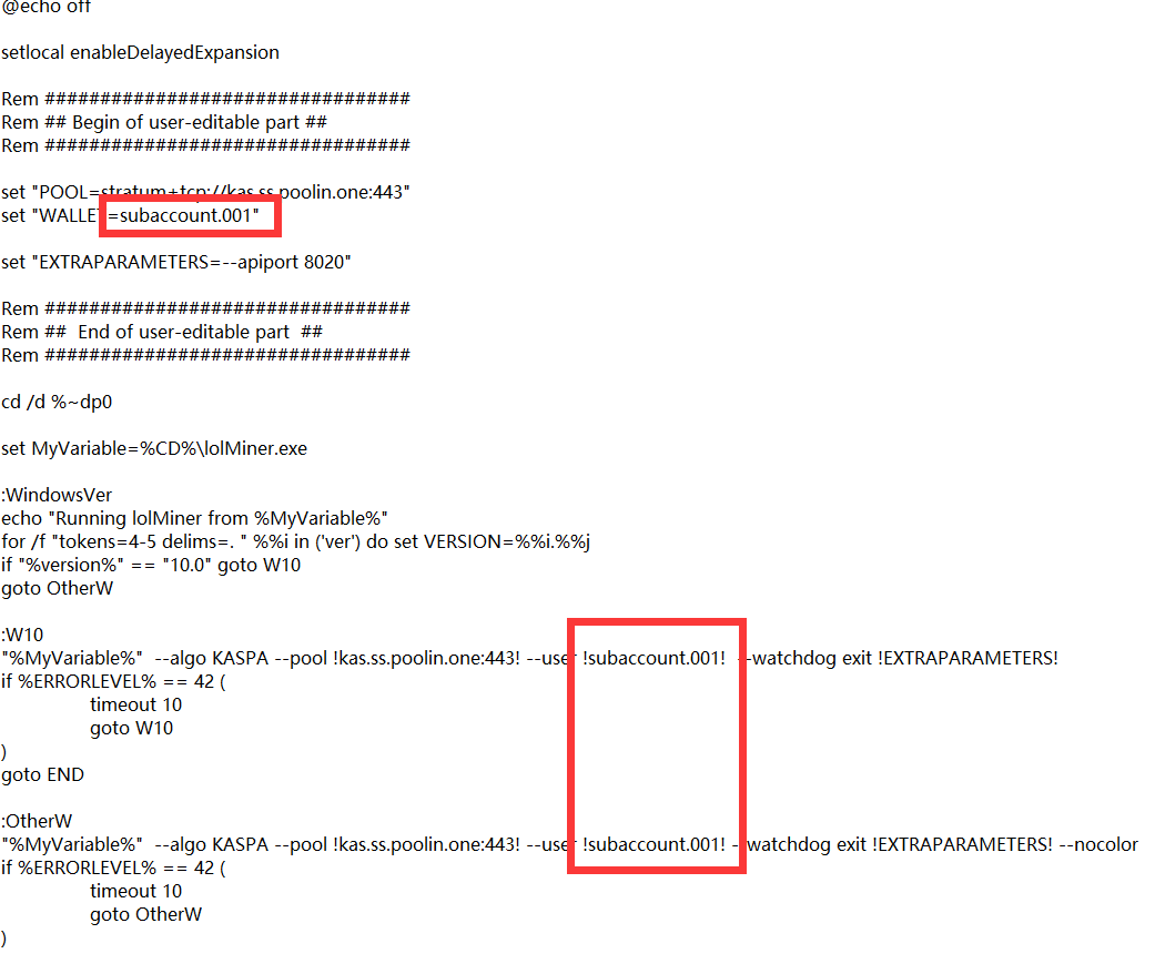 您也可以使用本文所附的LolMiner直接进行下载(拉至文章最下面即可看到)。我们已经为您修改好了基础设置,您在下载后只需要将文件中的红框部分替换为自己的子账户和编号即可。